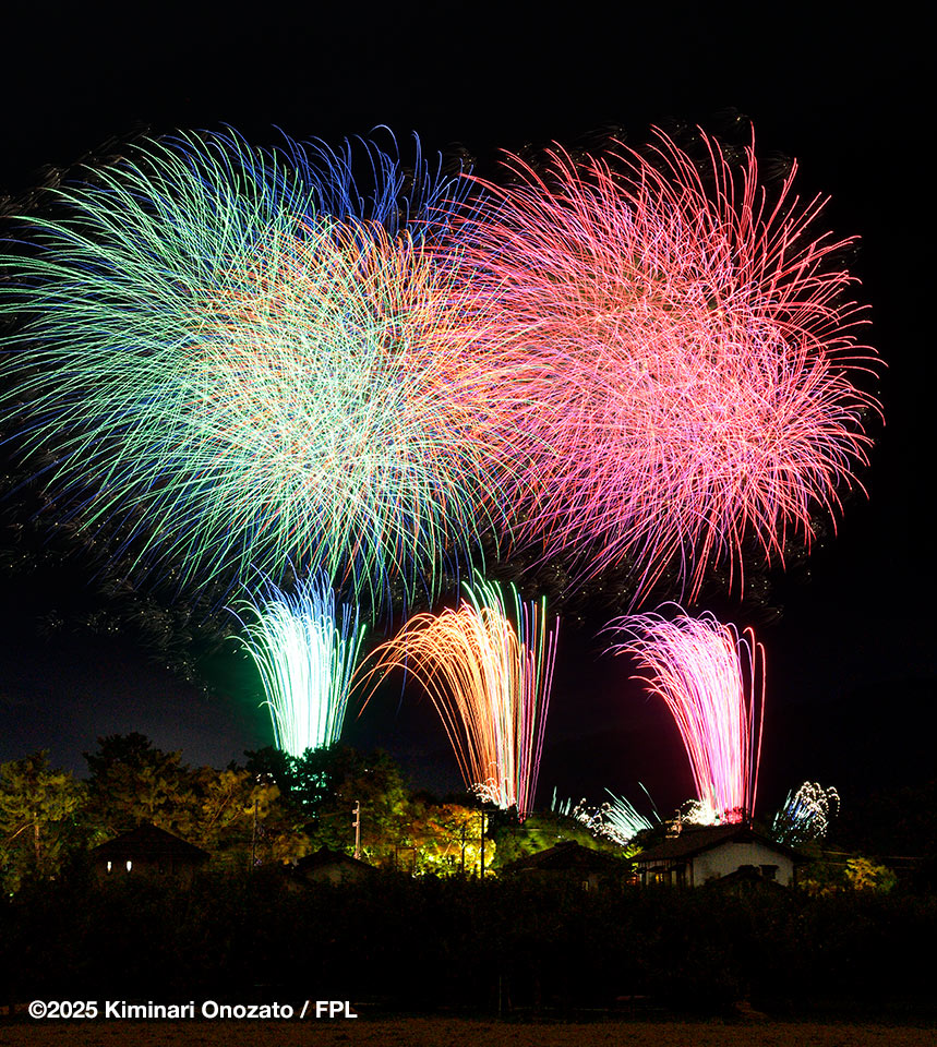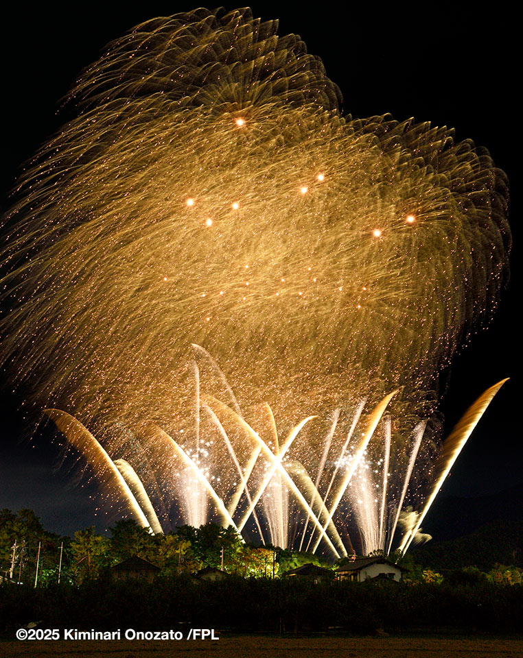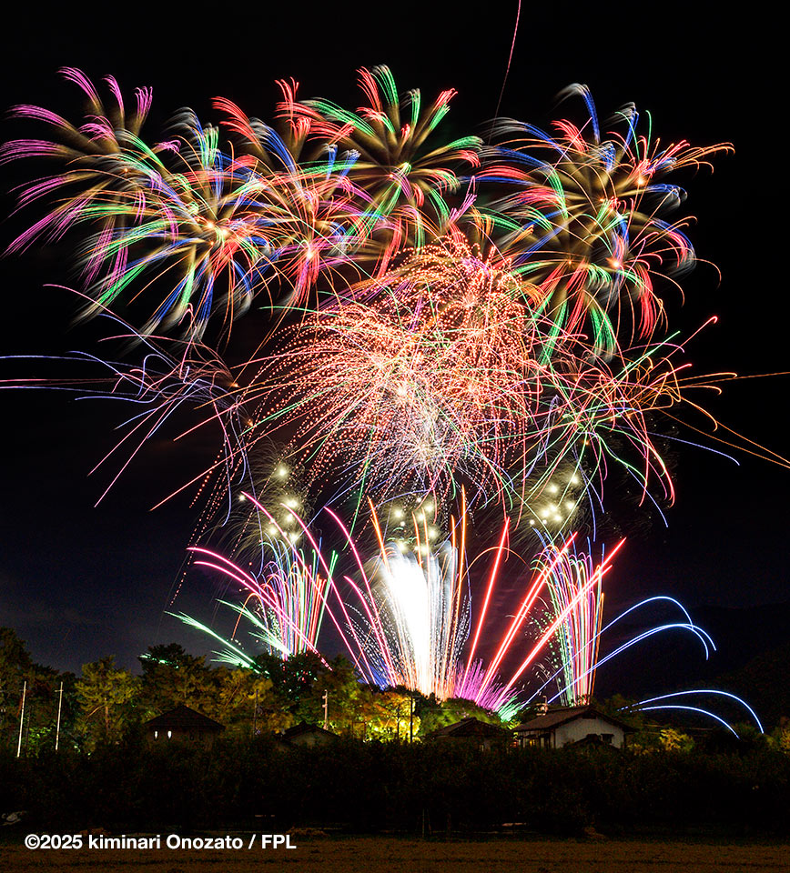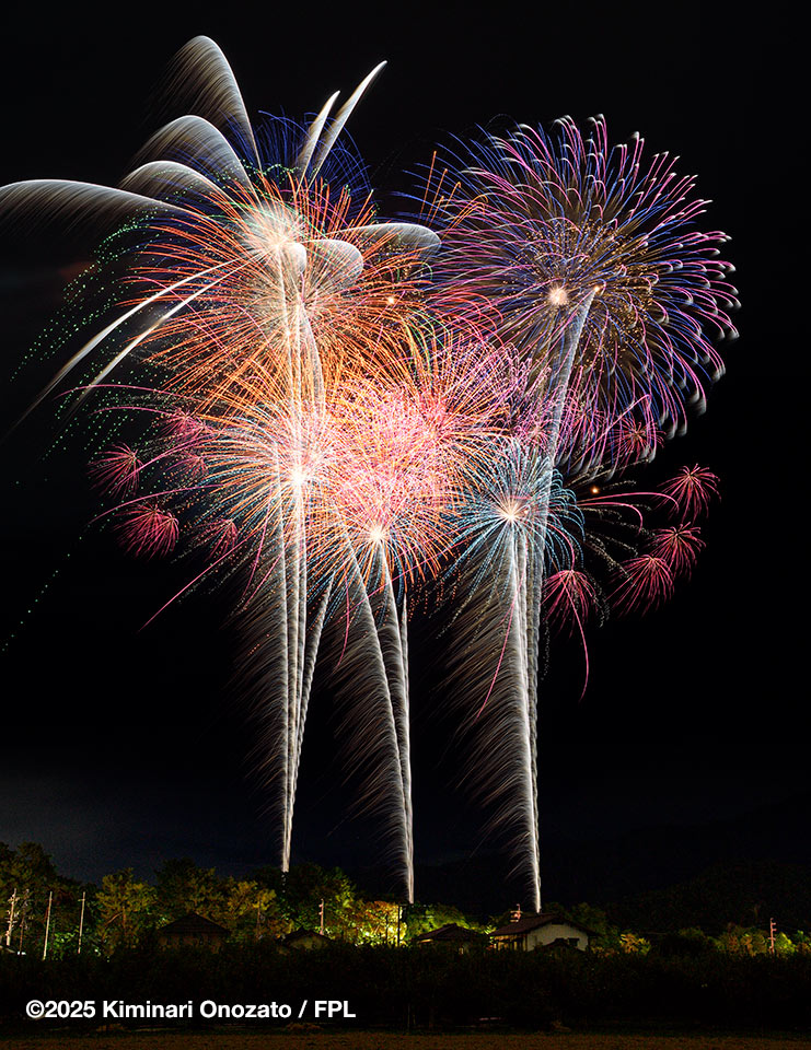 撮影場所には車で乗り付ける見物客はいなかったが、徒歩で参集した地元の見物客が10数名。写真を撮っていたのは私以外にもう一人。追い風が強くて会場でのアナウンスはほぼ聴こえなかった。出し物はプログラムで進行を確認しながらの撮り。発煙は向かって左奥に良好に流れていく。けれど中盤までは風が強すぎるのか左方向に星先も流れるのでフレーミングは修正が必要だった。