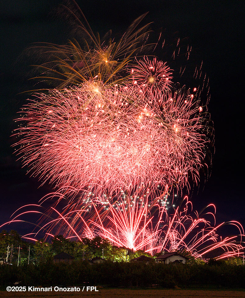 空全体を覆っていた雲も、19時過ぎには花火の背景方向だけはすっかり晴れて漆黒の夜空になっていた。面白いことに上空にはまだ雲が広がっていたのだが、長野市の中心部ということでその雲に町あかりが反射して、まるで天然のライティングのように辺りを照らし出していた。撮影場所周りにはいっさい街路灯とか民家がないから、月も見えない晩に真っ暗だと予想していたのに、道も田んぼもほの明るくなって懐中電灯なしでも帰れるくらいじゃないか。