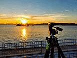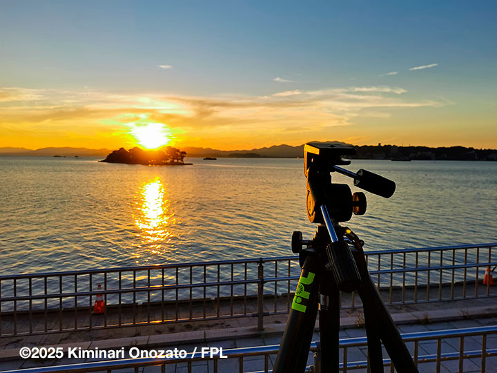正面、宍道湖で有名な「嫁が島」が、強烈な太陽光の下でシルエットになっていた。そこを挟んで4隻の台船が見てとれた。超ワイドというが、いやはやまさかこれほどとは思いもよらなかった。4隻が首を振らないと視界に入らない設置。やっちまったか・・・・。湖南地区からだと打ち上げ列が正面に相対する。画角を見るが、16ミリで台船4つを入れるのがギリギリ。そこから放射打ちされたら左右に展開する分は入らないか。あああ、11ミリとか14ミリとかもっと超広角もあったのになぁ。4箇所のうち無理なく、3つだけ入れるかとか撮影計画を悶々と悩む。カメラは予備を含めて2台持参したが三脚は1本のみ。