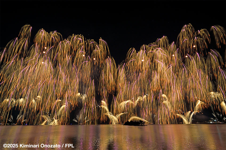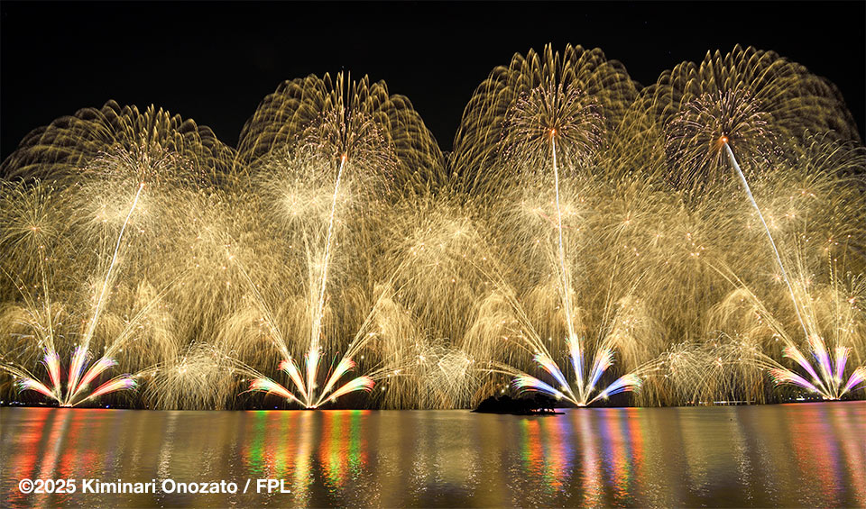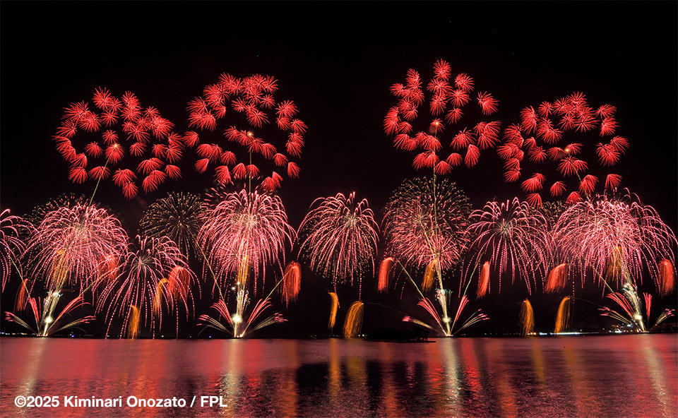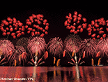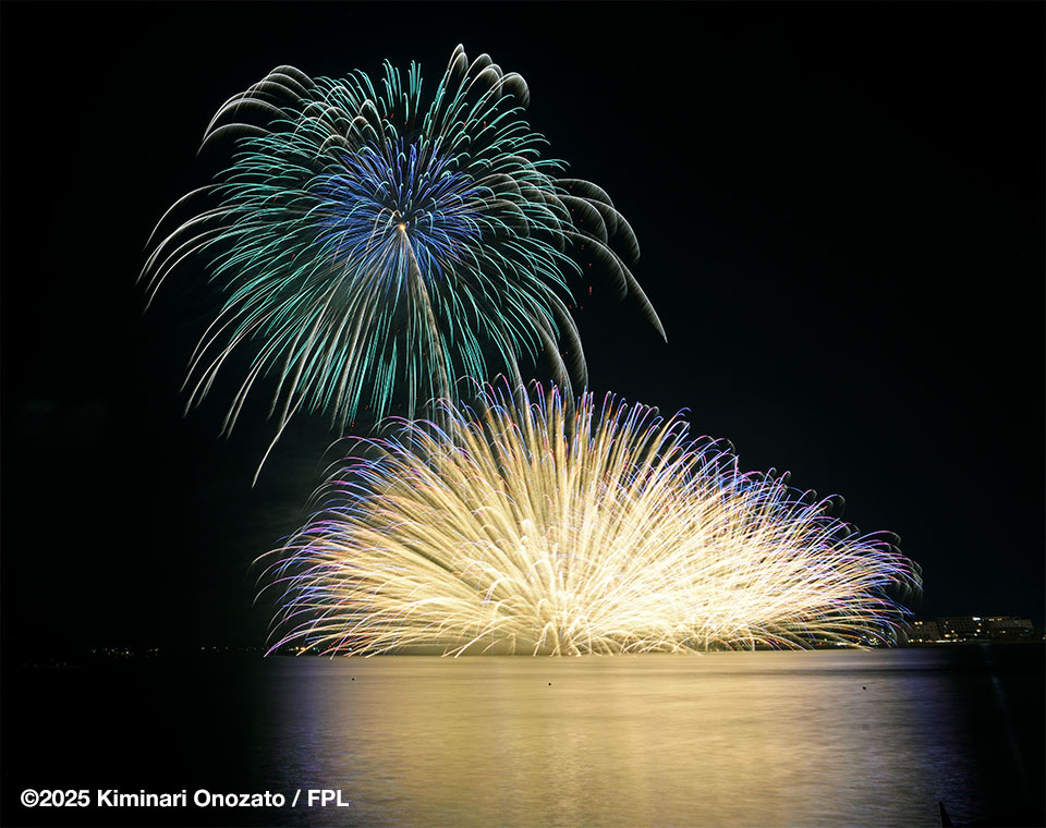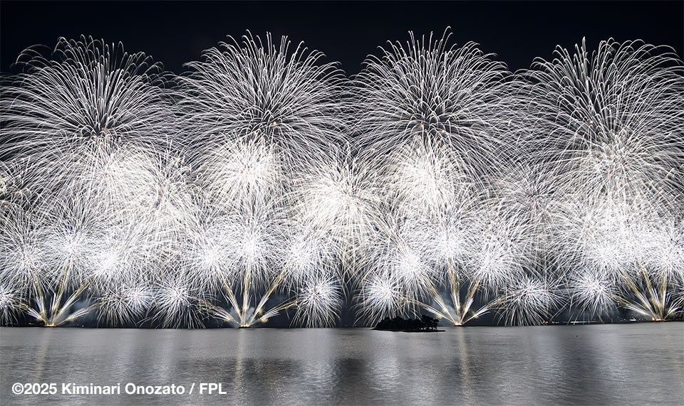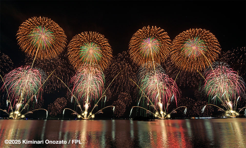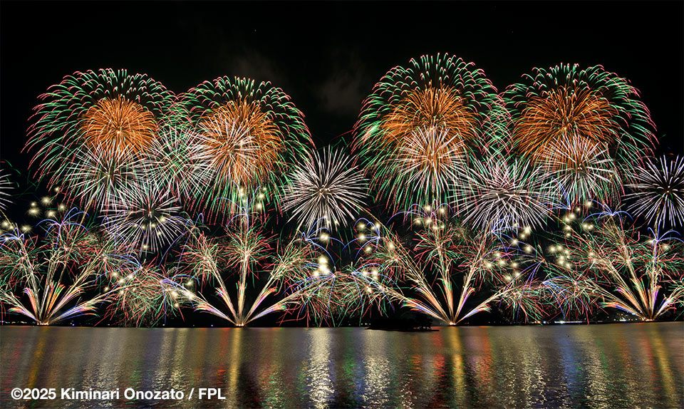 しかしそこからは「花火を打ってない時間はない」というくらい連続の打ち上げが45分間続く。途中で打ち上げのパターンが了解できる。玉の内容は変われど、打ち上げのパターンというかそれは常に同じ。だから初めての大会とはいえ撮りには対応しやすかった。花火担当は京都府の國友銃砲火薬店。琵琶湖や広島でも担当しているが、愛好家では有名な「國友打ち」という放射打ちが独特だ。ここでも全ての台船で見事なシンクロでそれが披露され、一瞬で上中下層全ての面を埋め尽くすその技巧に感嘆した。