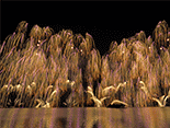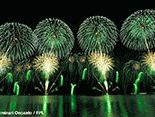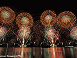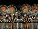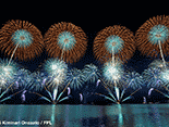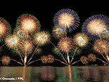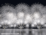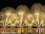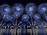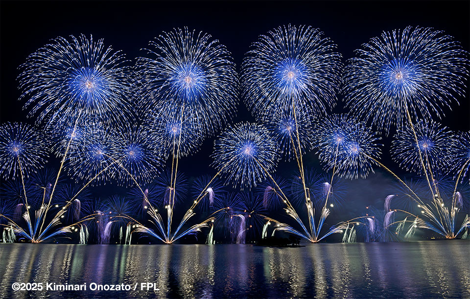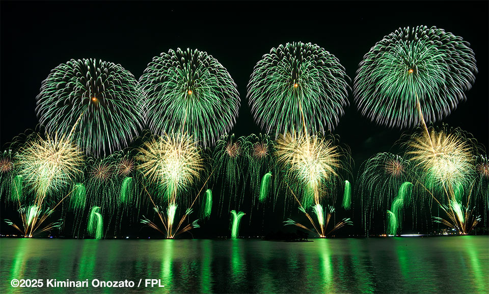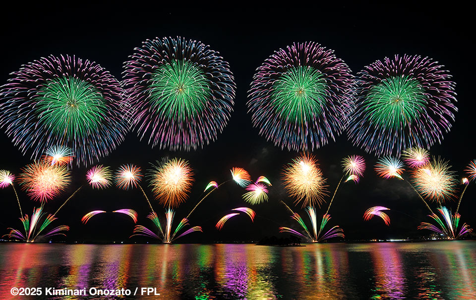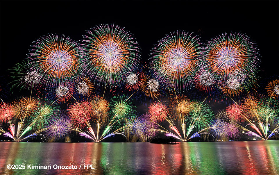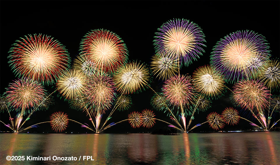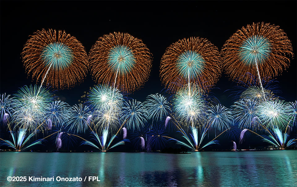 しかしそこからは「花火を打ってない時間はない」というくらい連続の打ち上げが45分間続く。途中で打ち上げのパターンが了解できる。玉の内容は変われど、打ち上げのパターンというかそれは常に同じ。だから初めての大会とはいえ撮りには対応しやすかった。花火担当は京都府の國友銃砲火薬店。琵琶湖や広島でも担当しているが、愛好家では有名な「國友打ち」という放射打ちが独特だ。ここでも全ての台船で見事なシンクロでそれが披露され、一瞬で上中下層全ての面を埋め尽くすその技巧に感嘆した。