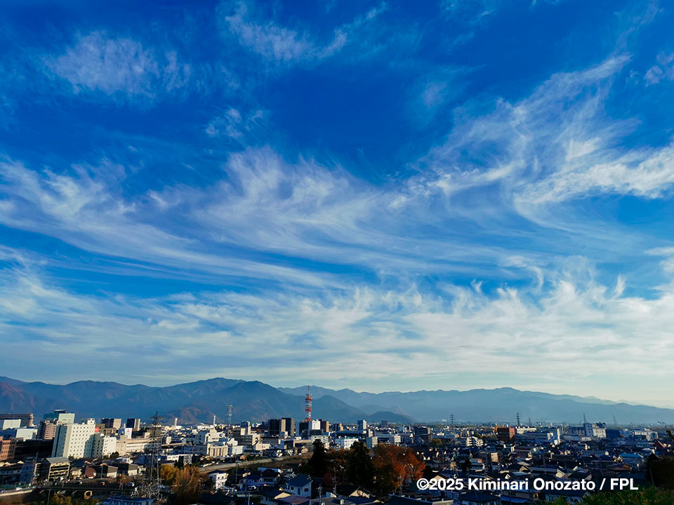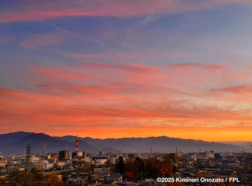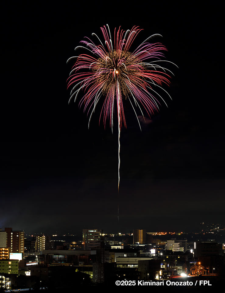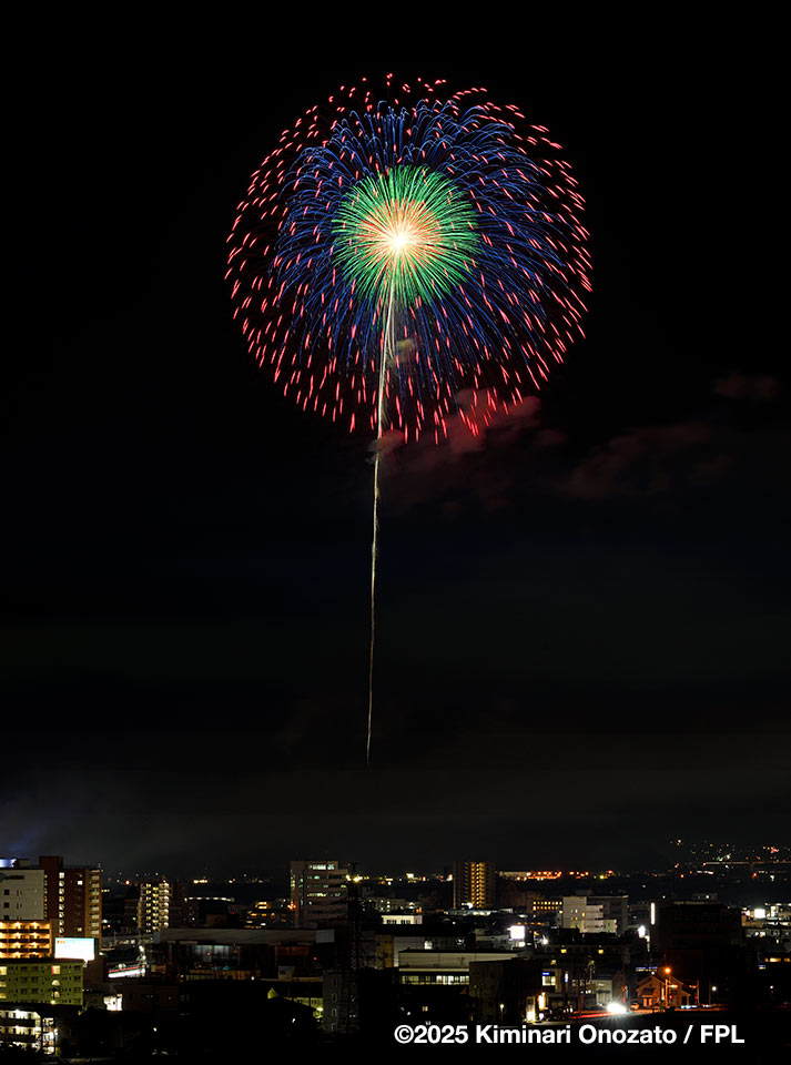 序盤、中盤と低空の煙は左方向に広がったから地上付近の風は南西方向なのかな。それが次第に半時計回りに向きを変えていって、終盤のプログラムの頃には、向かって一番高い建造物に見えるNTTコムウェア長野ビル屋上の紅白の鉄塔先端にある航空障害灯を超える高さまで発煙に覆われてしまっていた。私は昨年画角に入れていたので今回は花火にあまり絡まない程度に外す構図にしたのだけどそれが幸いしたか煙に霞んでしまってはなぁ。このビルは打ち上げ場所の北北東方向にある。つまり煙を押し流す風は南西から、南方向。低くそして厚みのある発煙の塊が雲海のようにゆっくりと市内に広がったのだ。この煙の層は地上150メートルくらいの高さか。