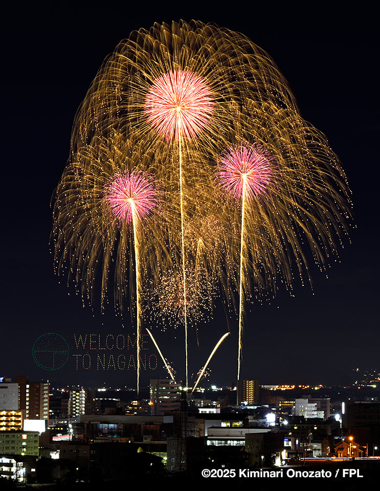 17時30分からレッドクリフによる長野オリジナルのドローンショー。見たところ花火は抜きの展開かと感じたが、ラストに「WELCOME TO NAGANO」と文字が浮かんだ直後にワイドスターマインで締め括った。もちろん昨年の経験から撮影は逃さない。本割の打ち上げは18時から。しかし開始のプログラム特別大スターマイン直後から異変に気がついた。