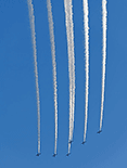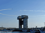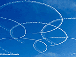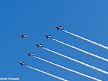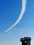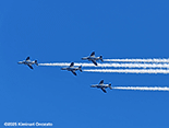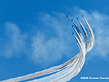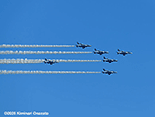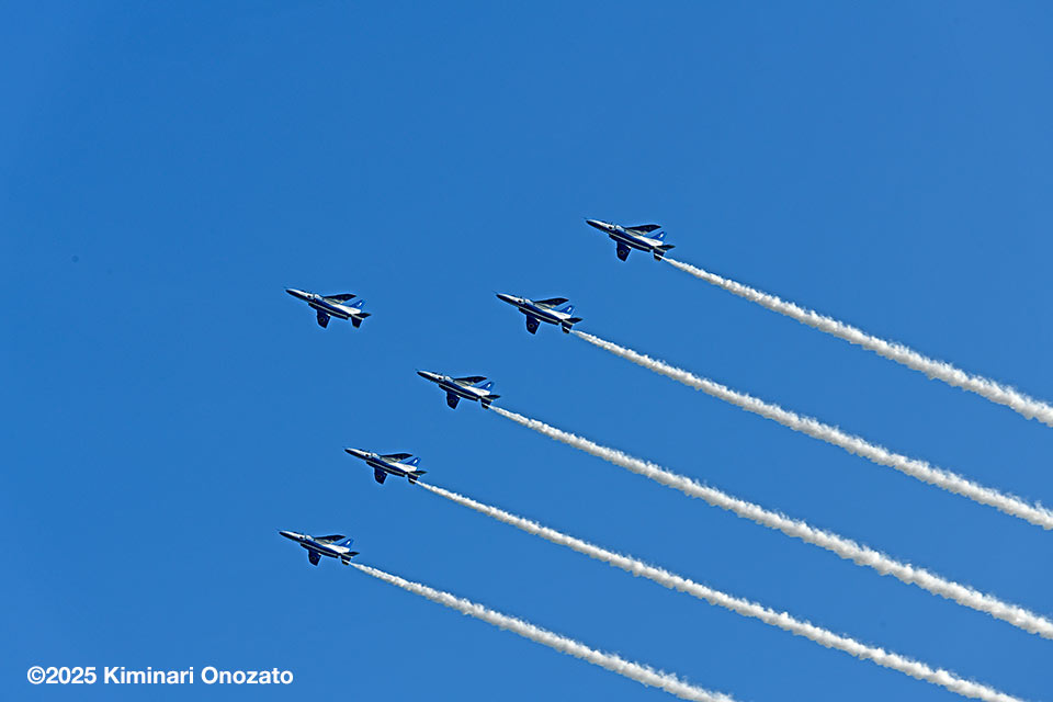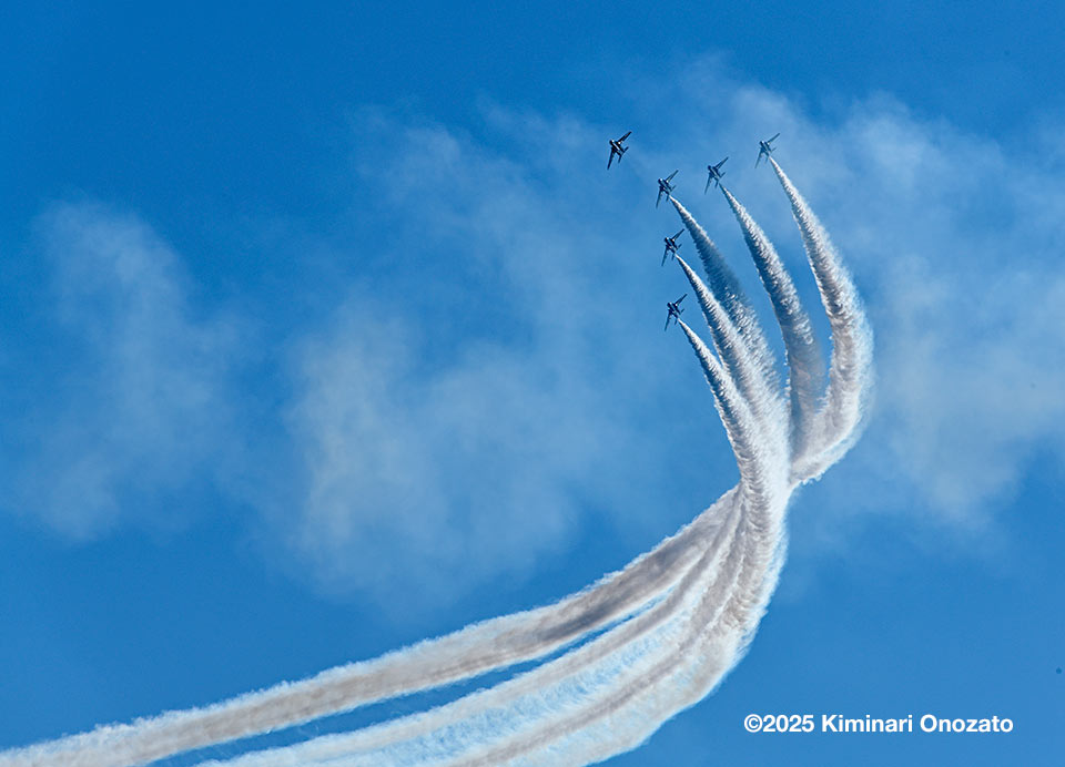 午前中は空全体が曇り状況で青空なんか見えなかっただけに、ブルーインパルスを見るには厳しいと思っていた。しかし午後から次第に晴天に転じ日差しも強烈で温度も上がった。6機編隊で登場時には快晴のコンディションに恵まれた。各地にブルー目当てだけの航空写真マニアが大勢集結していたらしいが、私の周りにも大砲を装着したマニアがちらほら。私はというと現在は300mmが手持ちレンズの最望遠。寄せるにはぜんぜん足りないけれど、青空に描かれるスモークを中心に撮った。メイン会場のサンビーチ側からだと綺麗に順光になるけれど、私の観覧場所からだと空の半分は逆光なので機体のカラーリングも綺麗に出ないし、シルエットになったりするので厳しい。