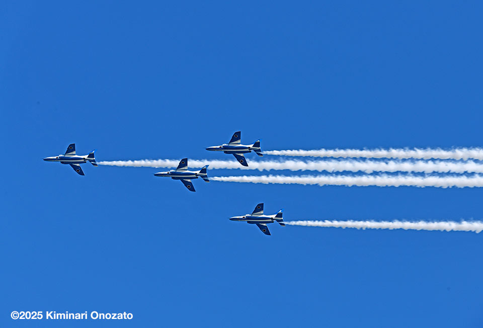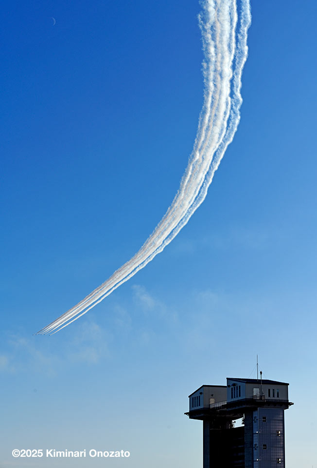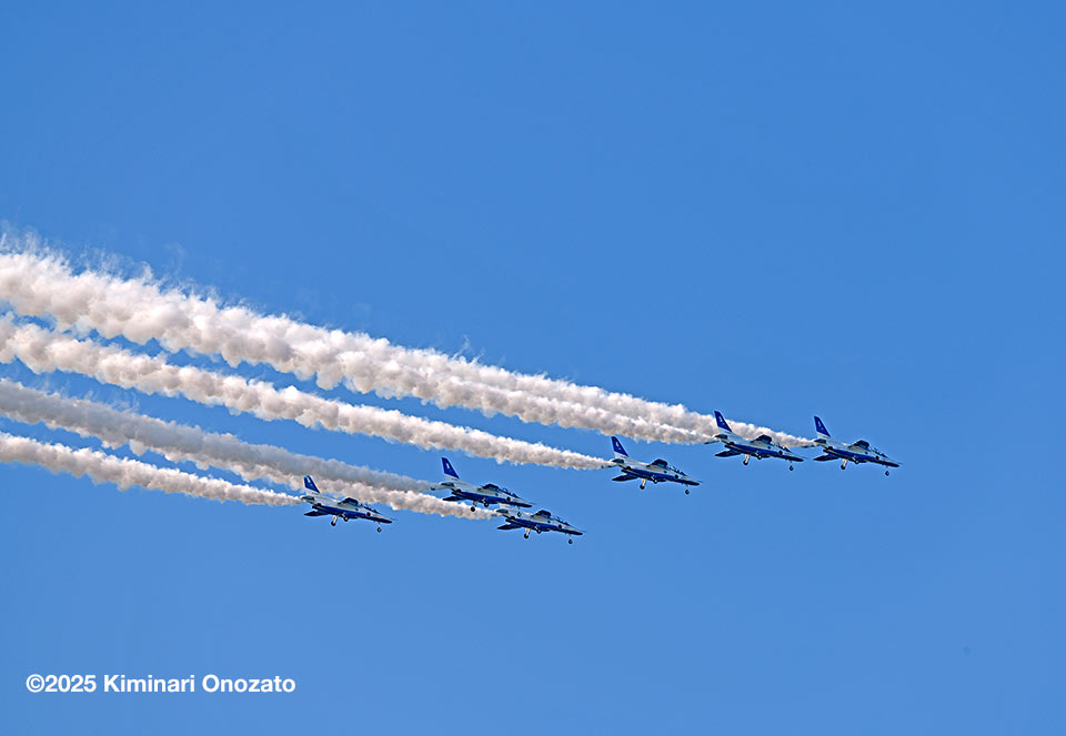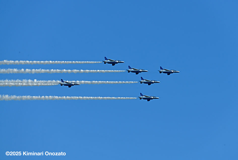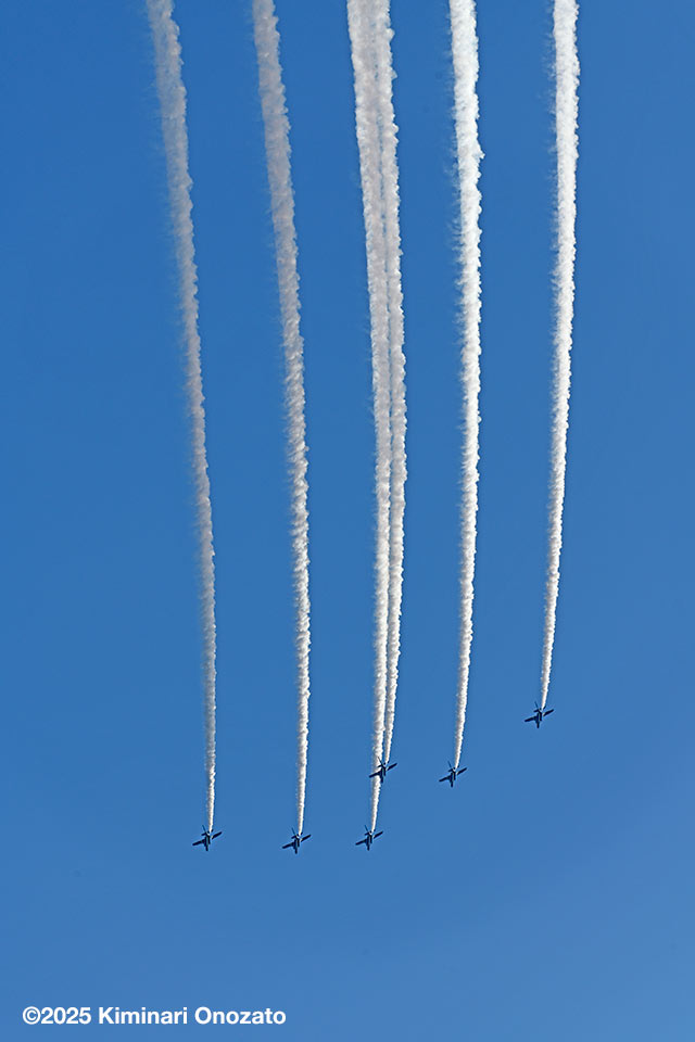 北側から侵入したブルーインパルスは、基地祭、航空祭の時のような派手な演技科目はやらなかったけれど、何度も隊形を変えて繰り返し飛んでくれた。ラストには6つの輪で描く桜やハートもやってくれて大満足の30数分だった。編隊は長くスモークを引きながら(スモークのオイルを使い切る?)百里基地へと帰還していった。ブルーインパルスは地元県内の入間基地航空祭などで初代の機体の頃からたくさん観たし撮ってきた。それでも目の前を飛ばれると相変わらず血が騒ぐ。