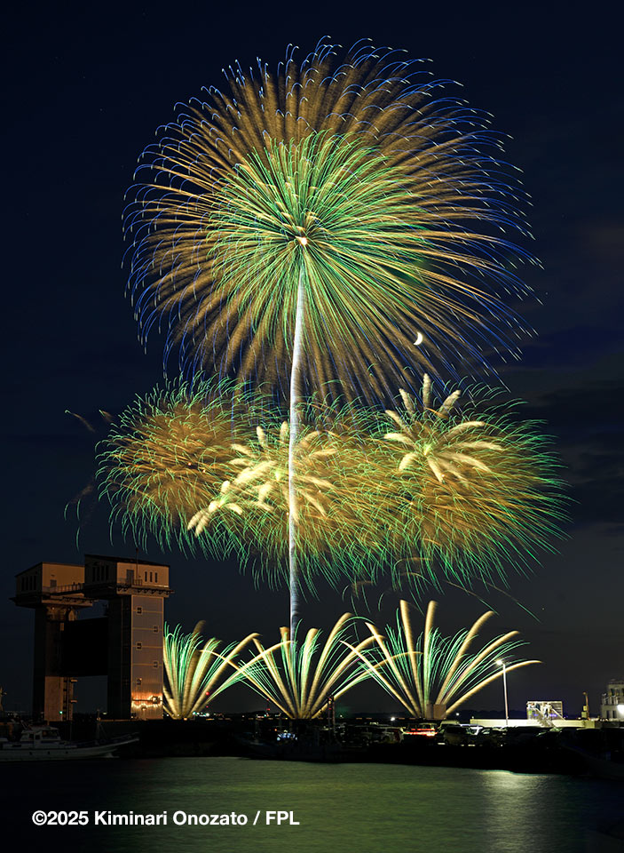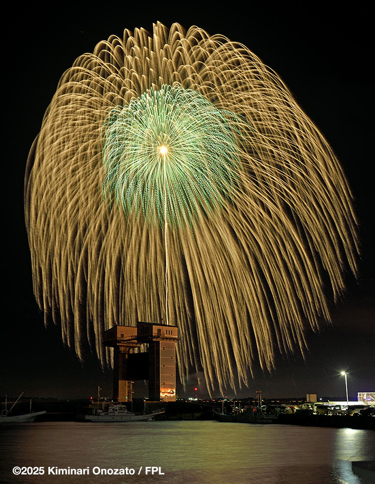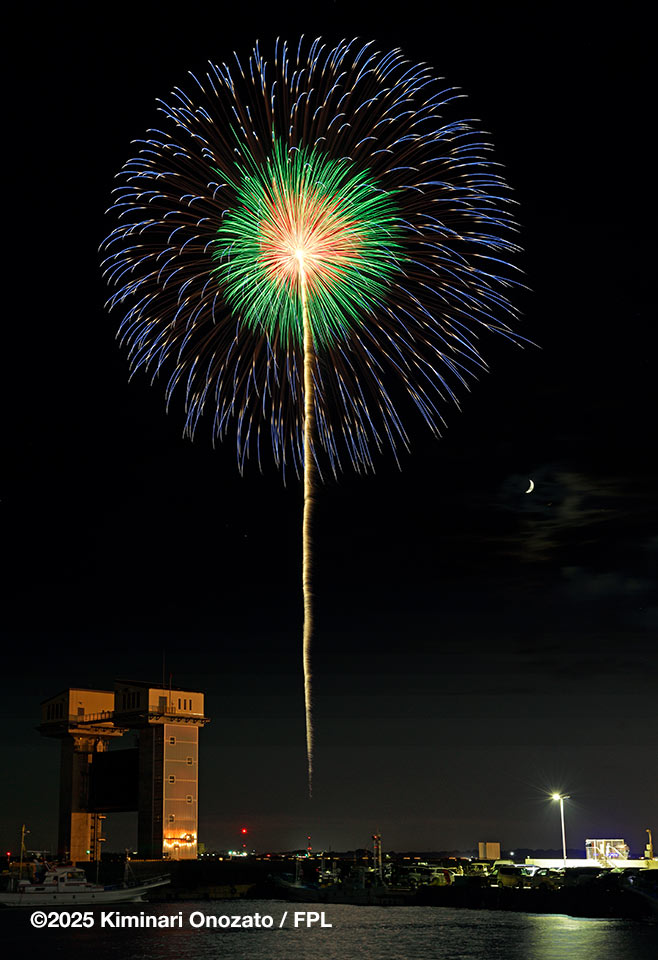 風は南西か南南西か発煙は向かって右手に横流れする感じでまずまず綺麗に見えた。目の前の海上は少し風によって荒れていて、綺麗なリフレクションが取れなかったので2023年の時とは違ってその部分は入れない構図。終了は19時30分を少し過ぎた。ラストワイドスターマインのプログラムが終わったところで、次の最終の20号までの間が空いたので終了と判断したのか周りの一般客は一斉に帰り始めた。設置場所が10号より少し海側に離れているので構え直しが必要。画角や向きを変える時間はあったし、打ち上げタイミングもつかみやすかった。20号は緑の点滅芯が入った錦冠菊で綺麗に決まった。
