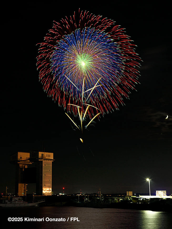 2023年に観覧した時に工事中でその後完成した大洗港区水門を入れての絵を考えていた。凱旋門のような佇まいがアクセントになると考えた。結果的に思っていたのと少し違った絵になったけれどまぁこれはこれで。思い描いていた構図を実現するには、漁港にずらりと係留されている漁船とかが手前にあって難しかった。この大洗港区水門自体は当然ライトアップなんかされていないから、良くてシルエットになるのだが、フェリー埠頭に停泊中のさんふらわぁ号の灯す大量の電飾で結構照らし出されているのでなんとか存在を写し込める。
